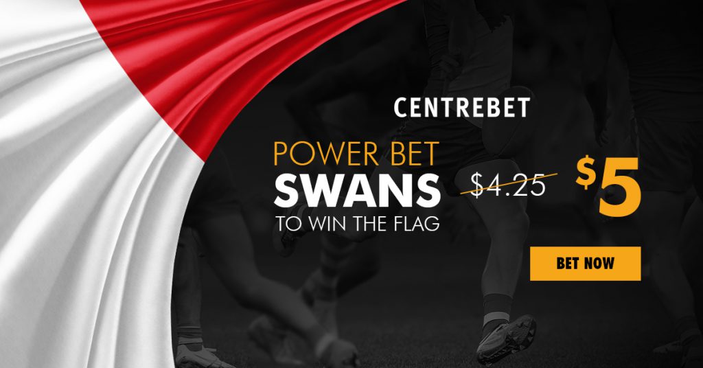 Online bookmaker Centrebet have opened up an awesome offer for footy fans this AFL Finals series. The Centrebet Power Bet is offering a massive $5.00 odds on the well fancied Sydney Swans to win the AFL Grand Final! View this AFL offer and sign up to Centrebet for more great offers today!
