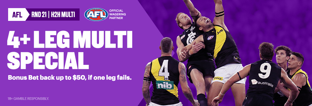 Online bookmaker BetEasy have an awesome AFL Multi Bet Offer for Round 21. Place a 4+ leg Head to Head multi on Round 21 AFL matches and if your multi misses by 1 leg, you’ll get your stake back as a Bonus Bet up to $50.