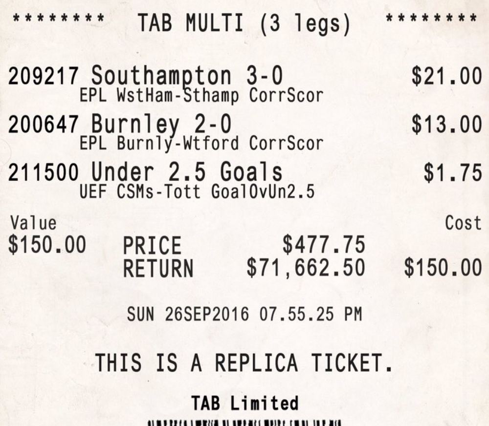 A punter with the TAB has turned a measly $150 bet into a whopping $71,661 this morning. View the bet below.