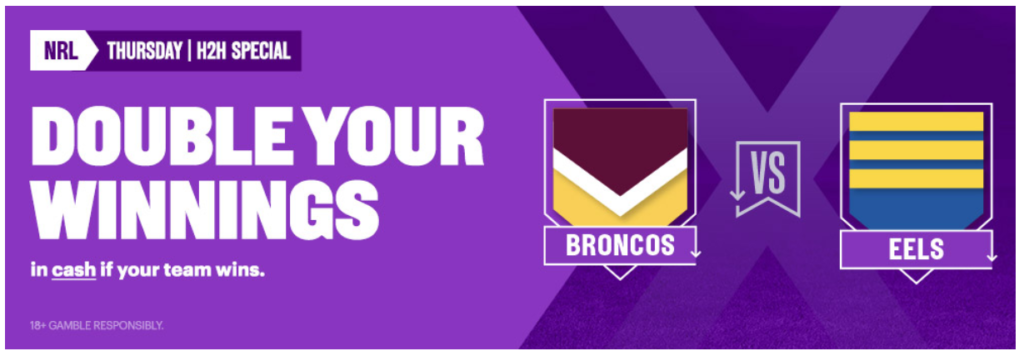 Online bookmaker BetEasy have an awesome Double Winnings Offer on selected NRL matches this week including the Brisbane Broncos vs Parramatta Eels game. Place a Head to Head bet on the selected NRL match this week and if your team win, we will double your winnings in cash*.