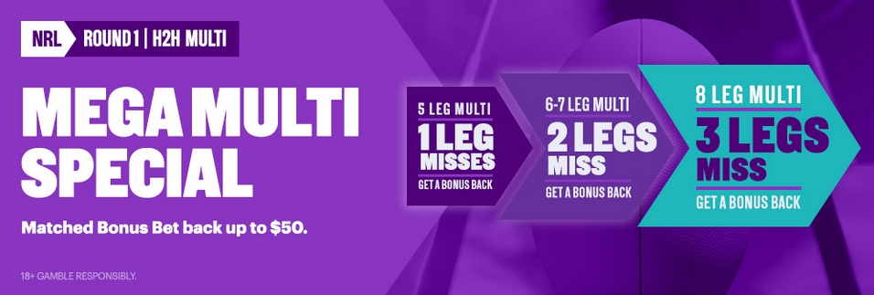 Applies to your first 5+ leg Head to Head multibet placed on NRL Round 2 matches only.