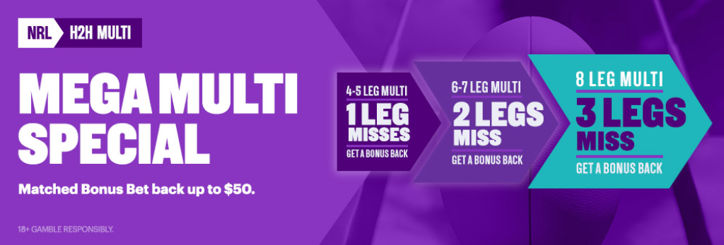 - Applies to your first 4+ Leg Head to Head NRL multibet placed on the selected Round of NRL matches.